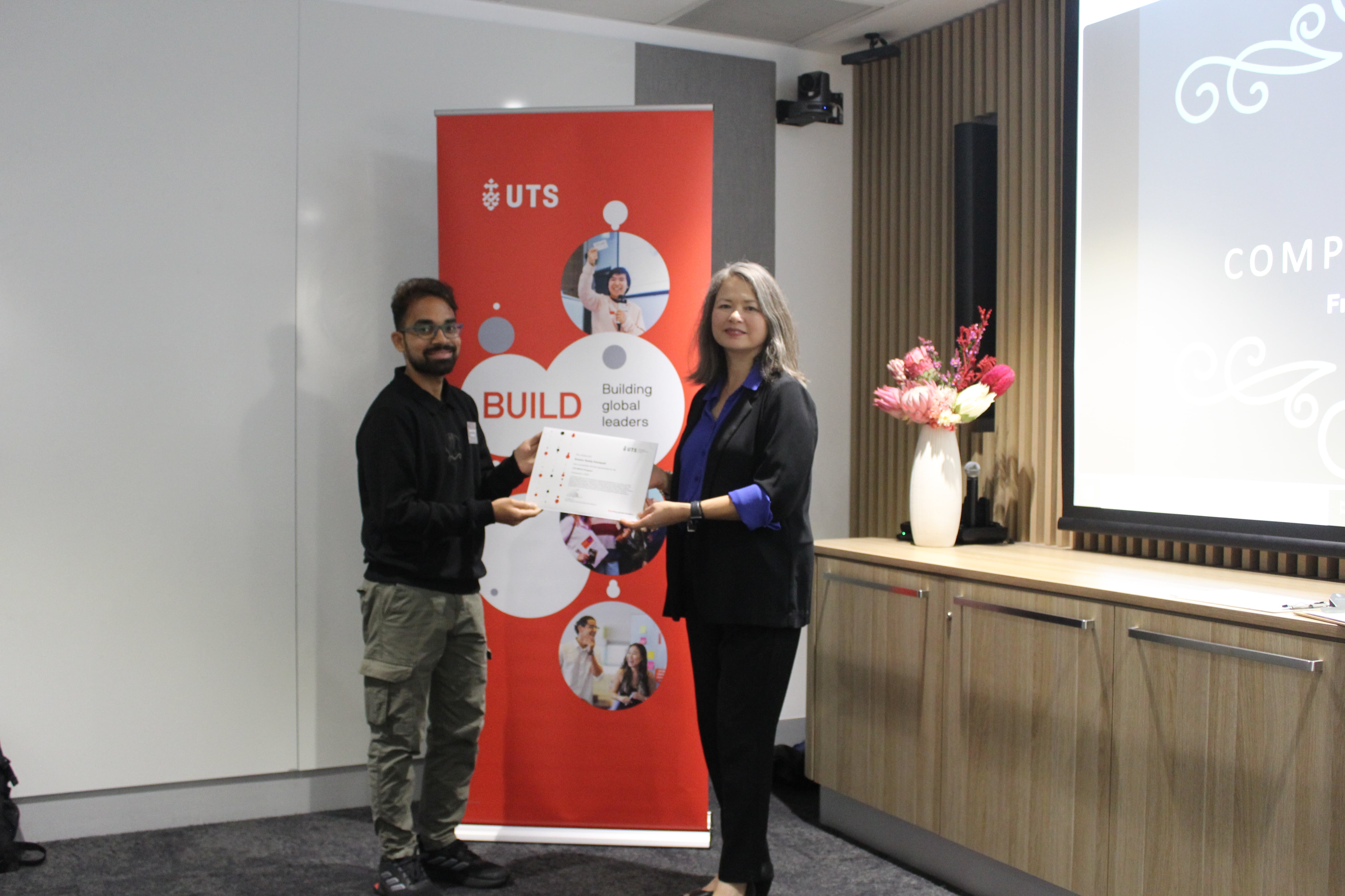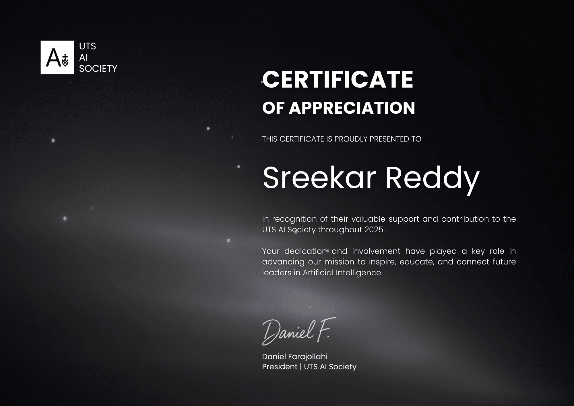 Recognised for contributions during the 2025 academic year, supporting events, initiatives, and the mission of inspiring future leaders in Artificial Intelligence at UTS.