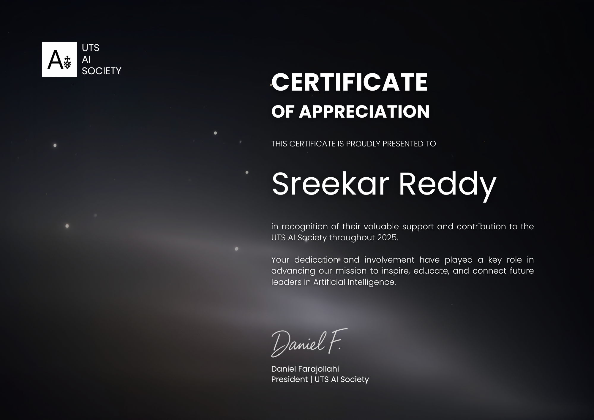 Recognised for contributions during the 2025 academic year, supporting events, initiatives, and the mission of inspiring future leaders in Artificial Intelligence at UTS.